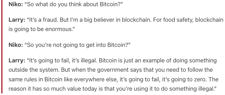Then, in June 2018, @NikoJilch interviewed Larry Fink in Austria, where Fink called Bitcoin a "fraud," and said that it's "going to zero" and "going to fail." (oof)