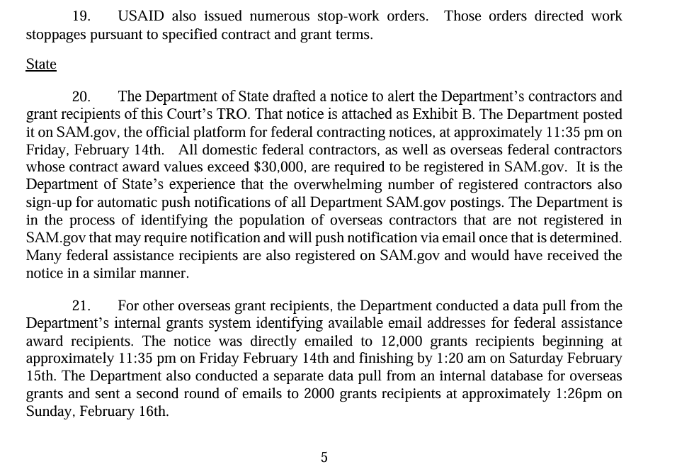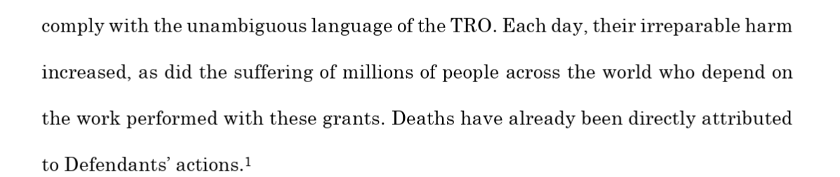 4/ Well, well, well, here we have Plaintiffs in case against USAID filing an emergency motion to enforce TRO complaining that Government's status report claims the government is complying with TRO. Why? Well, let's read: