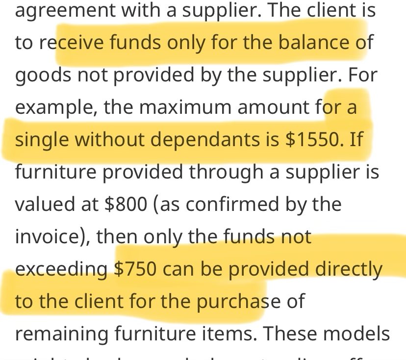 First up, we have a one-time Furniture Allowance. It's up to $1550 for a single person WITHOUT dependents.