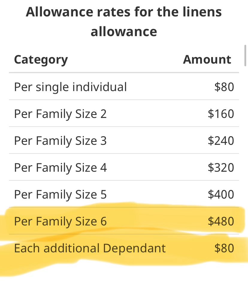 Next we have a Linens Allowance. A single person gets $80. A family of six gets $480. Additional kids get $80 more.