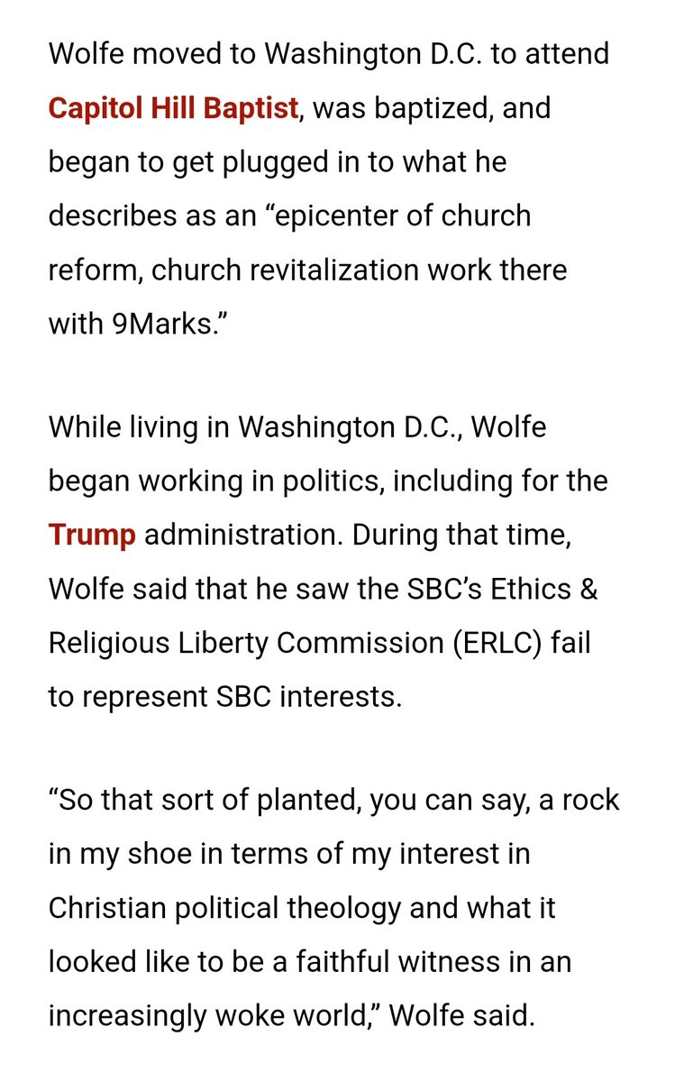 Wolfe, a leading provocateur for the current Christian Nationalist psy-ops, was brought to faith and baptized by the political operative Mark Dever at Capitol Hill Baptist, a fact he doesn't hide from, although he avoids comment on Dever's Wokeness, despite big disagreement.