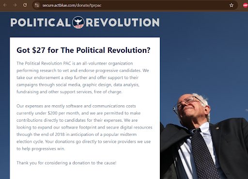 When you click the “Donate” button on Political Revolution’s website, it takes you to an @actblue page that features a giant picture of Bernie Sanders.