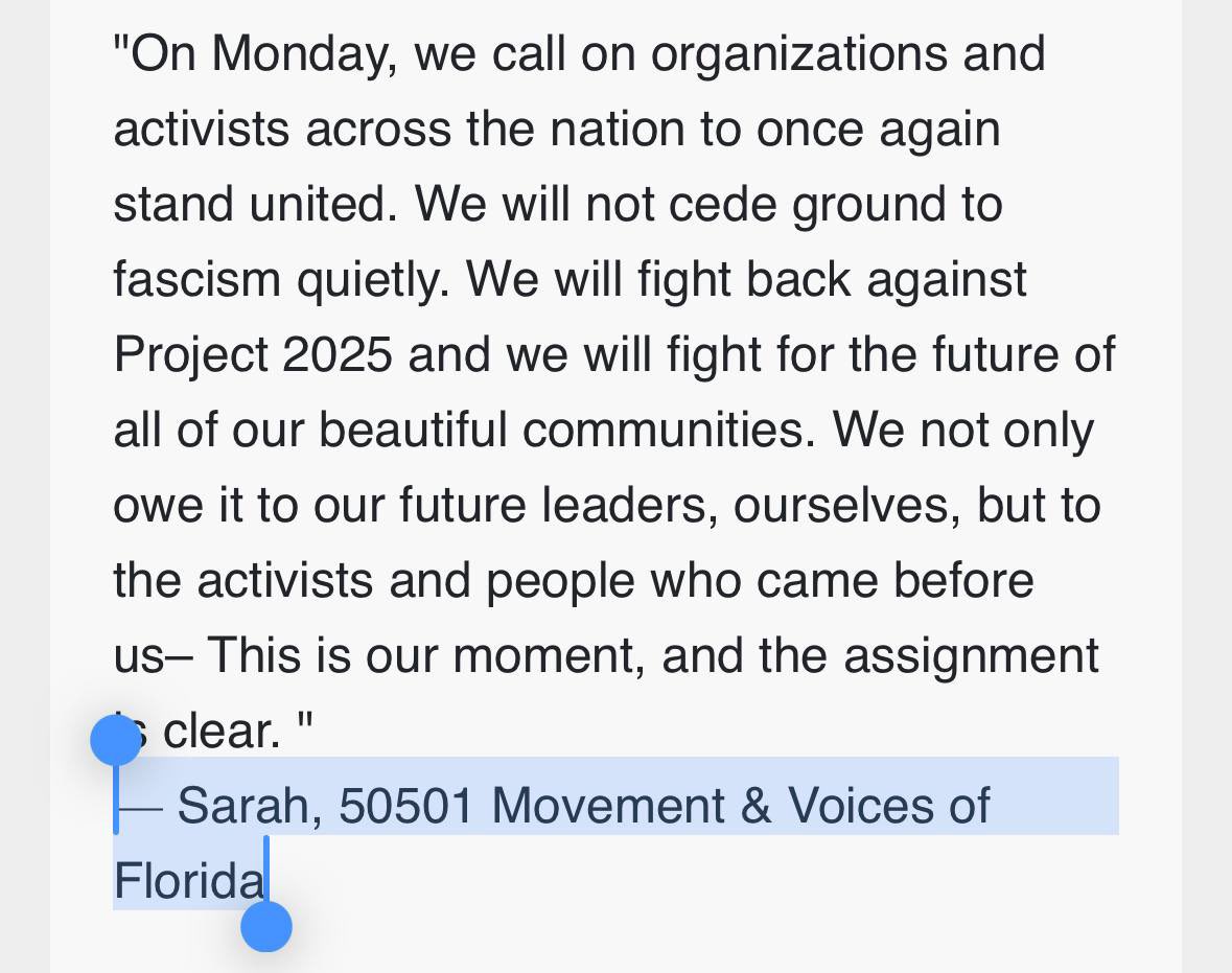 The other press contact listed for 50501 is Sarah P., who works with an organization called “Voices of Florida”.