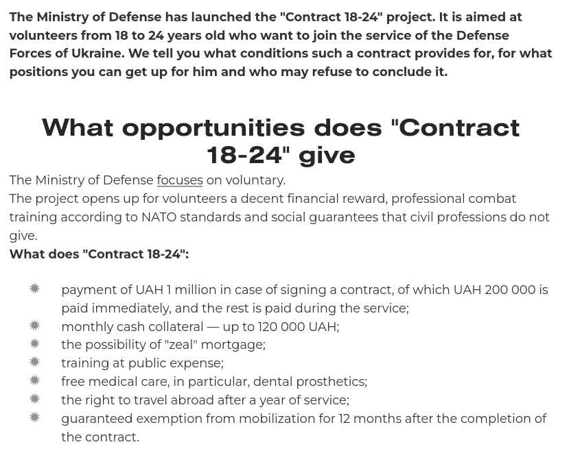 Die ukrainische Regierung hat jetzt ein Programm aufgelegt, dass fairere Bedingungen für Freiwillige zum Wehrdienst in der Altersgruppe 18-25 bietet: