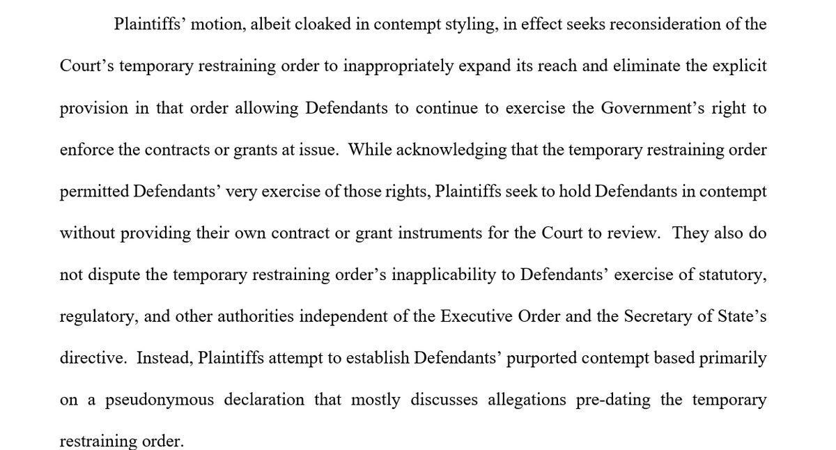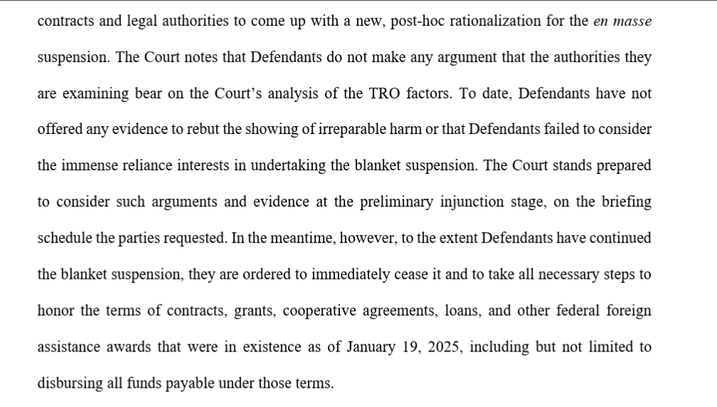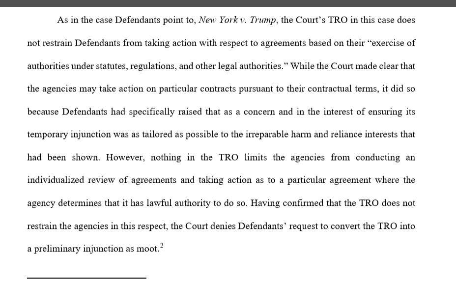🚨🚨🚨Court grants motion to enforce TRO in favor of Plaintiff NGOs who are complaining grants were improperly withheld but reuses to hold Trump Administration in contempt. The order is incomprehensible. 1/