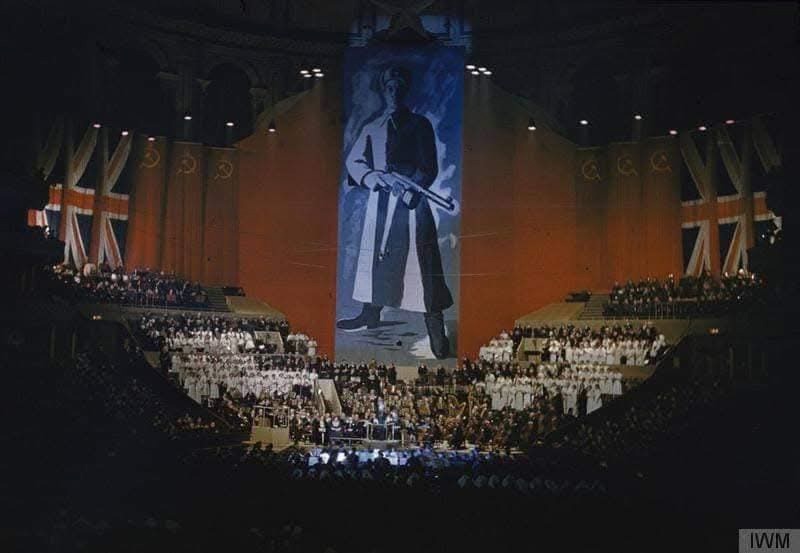 El enorme escenario del Albert Hall está decorado con un panel que representa una ciudad soviética y la bandera de la URSS. En el escenario están las orquestas de la Filarmónica de Londres, la British Broadcasting Company y la Royal Choir Chapel. +