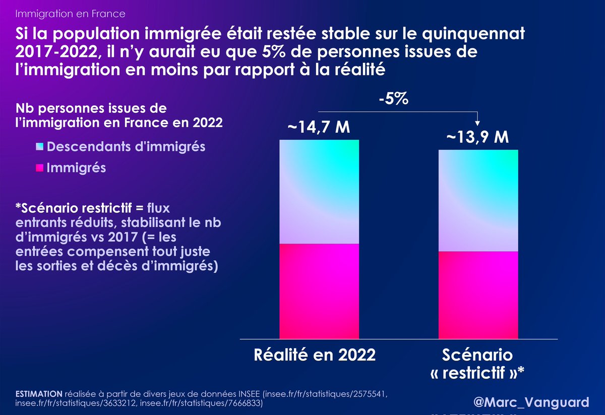 👉 L'une d'entre elles est que même une politique "immigration net zéro" n'aurait que peu d'impact sur le nombre total d'immigrés et descendants d'immigrés à l'échelle d'un quinquennat.