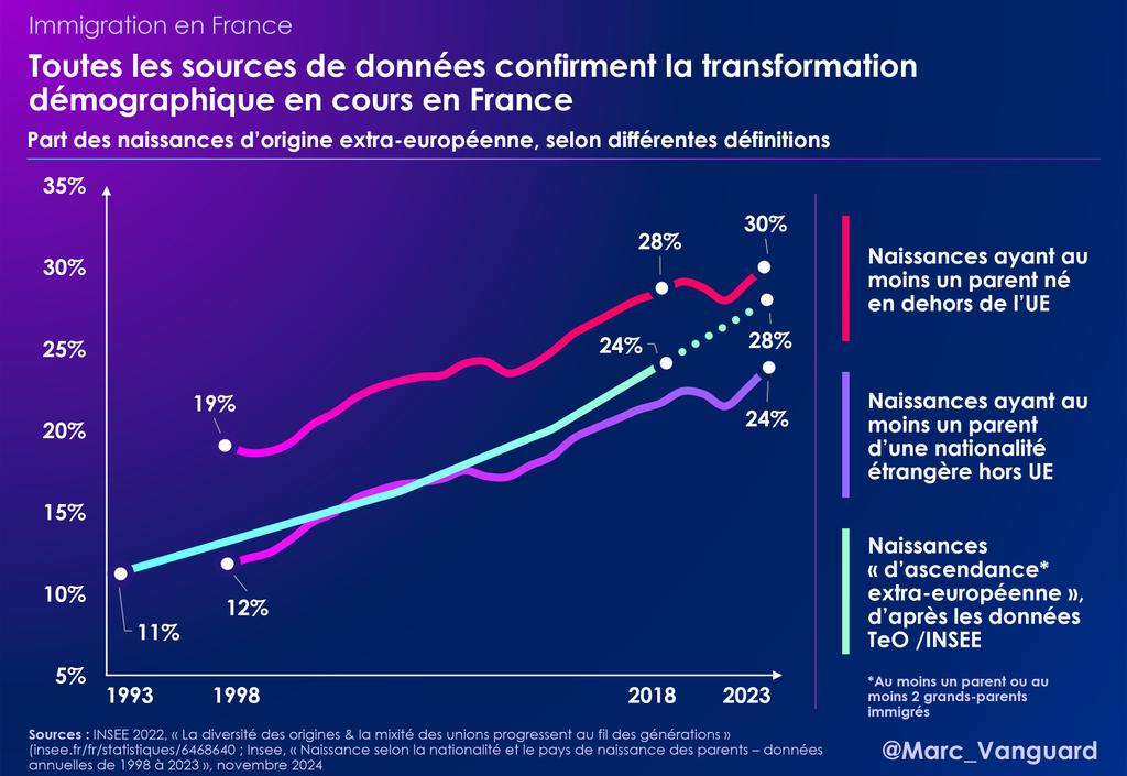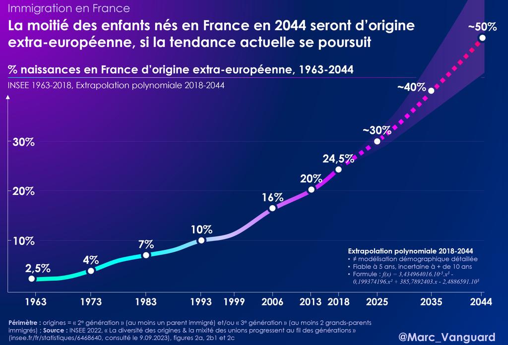 ... la tendance actuelle pousse plutôt sur une majorité de naissances d'ascendance extra-européenne d'ici 2040-2060 selon les estimations ⬇️