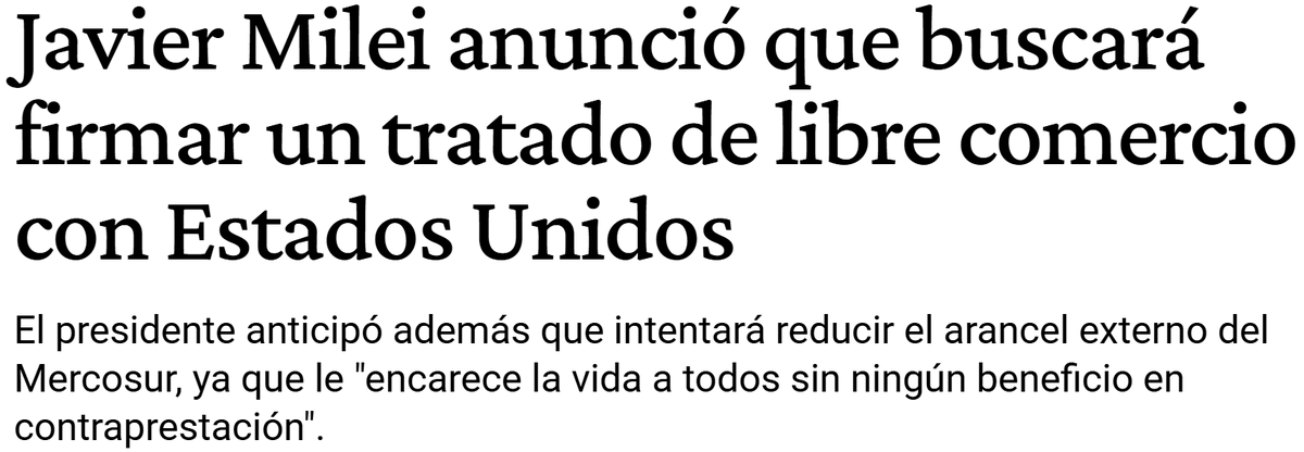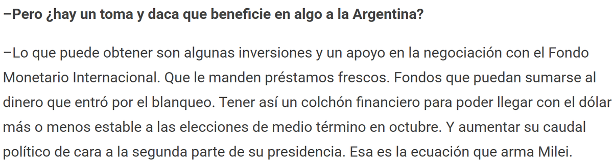 (8) ¿Qué favores puede conseguir Milei de EE. UU.? Puede obtener algunas inversiones y un apoyo en la negociación con el Fondo Monetario Internacional, así como convertirse en un socio comercial e ideológico clave para EE. UU. en el continente. Pero, sobre todo, podría convertirse en un modelo de país supeditado a los intereses de EE. UU. que pudiera replicarse en el futuro en el resto de países de Sudamérica.+