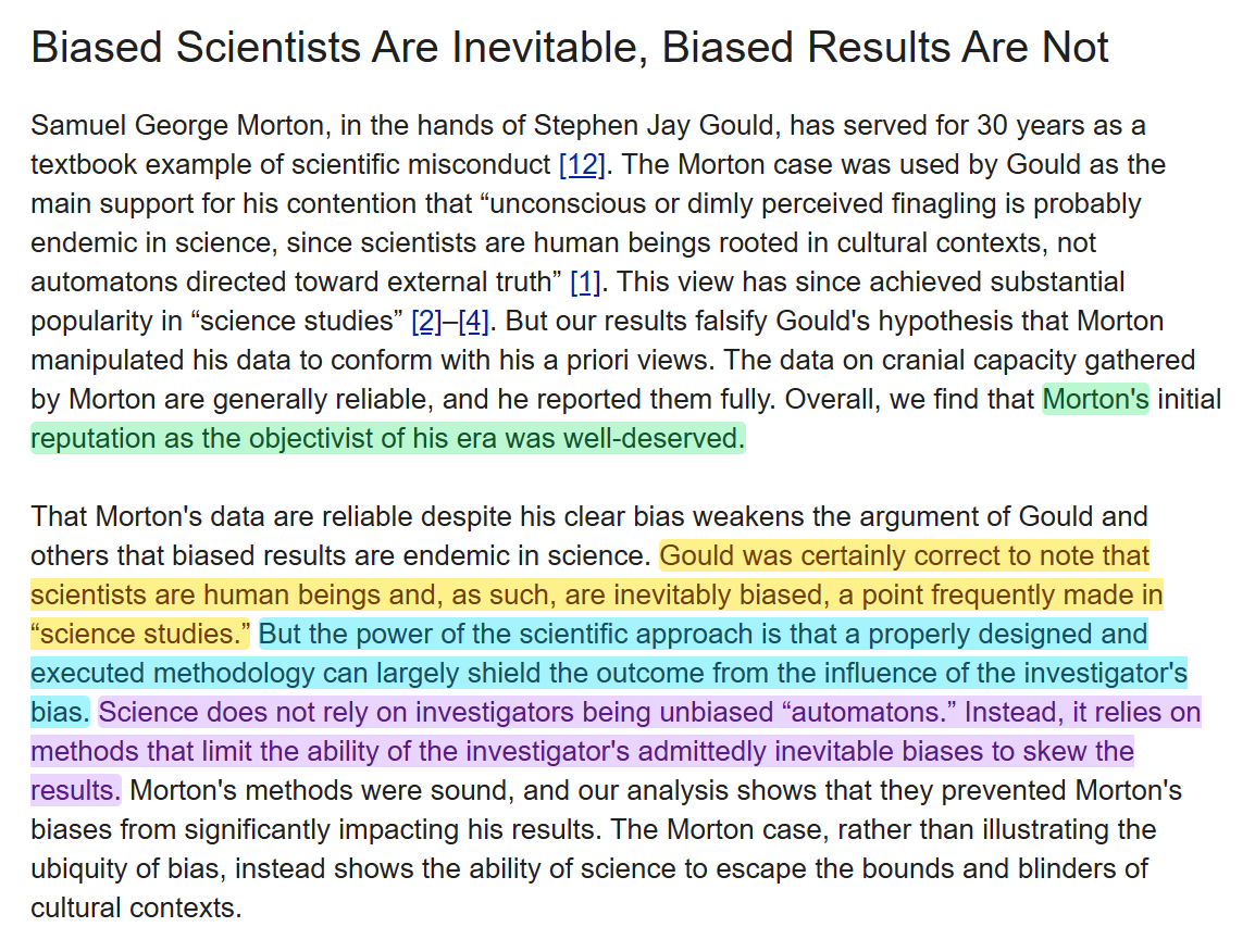 Morton, on the other hand, may have had his biases, but they failed to influence his work, because he was a scientist, and scientific methods limit the influence of bias.