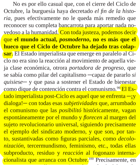 Hoy no es que haya sido derrotada solo una revolución, es que lo ha sido la Revolución Proletaria Mundial. Con esta, ha caducado una forma históricamente determinada de hacerla, un paradigma de la revolución, con sus premisas ideológicas aparejadas.