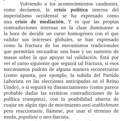 Es decir, el corporativismo no es una lógica de agregación política ajena a las del capitalismo como formación social, sino producto de la entrada en su fase decadente. Hoy, uno de los elementos que empuja hacia su reconfiguración posmoderna es la fracturación de su base social. Comité por la Reconstitución, “Editorial: Reconstituir el futuro en medio de la crisis del presente” en Línea Proletaria 1 (2017)