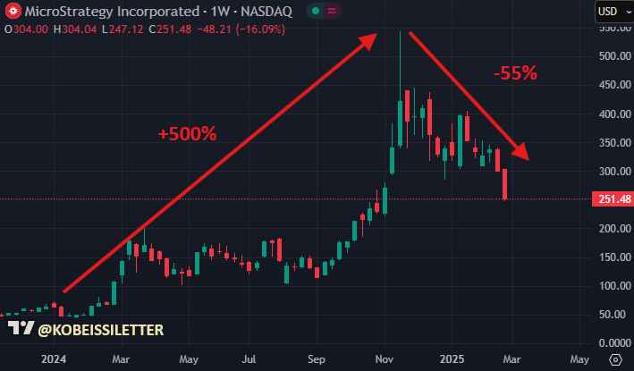 We are now witnessing the first "bear market" in MicroStrategy since it gained popularity in 2024.