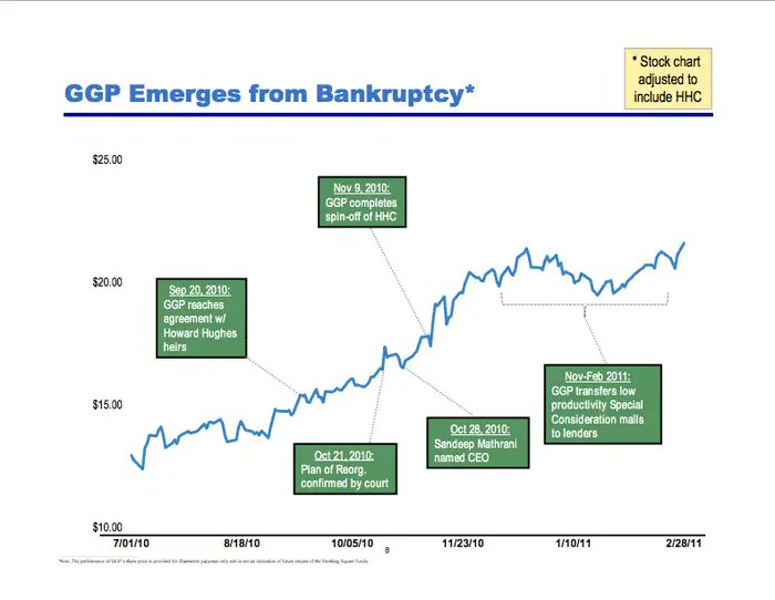 After encouraging them to file bankruptcy and buy time with creditors, GGP sold assets & emerged from bankruptcy turning Ackman's $60M investment into $1.6B.