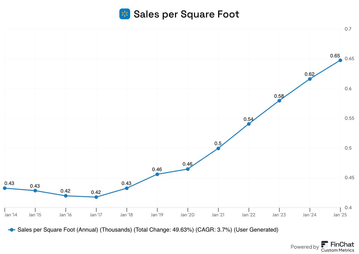 Last year Walmart averaged $650 of sales per square foot. That's up ~50% from a decade ago.