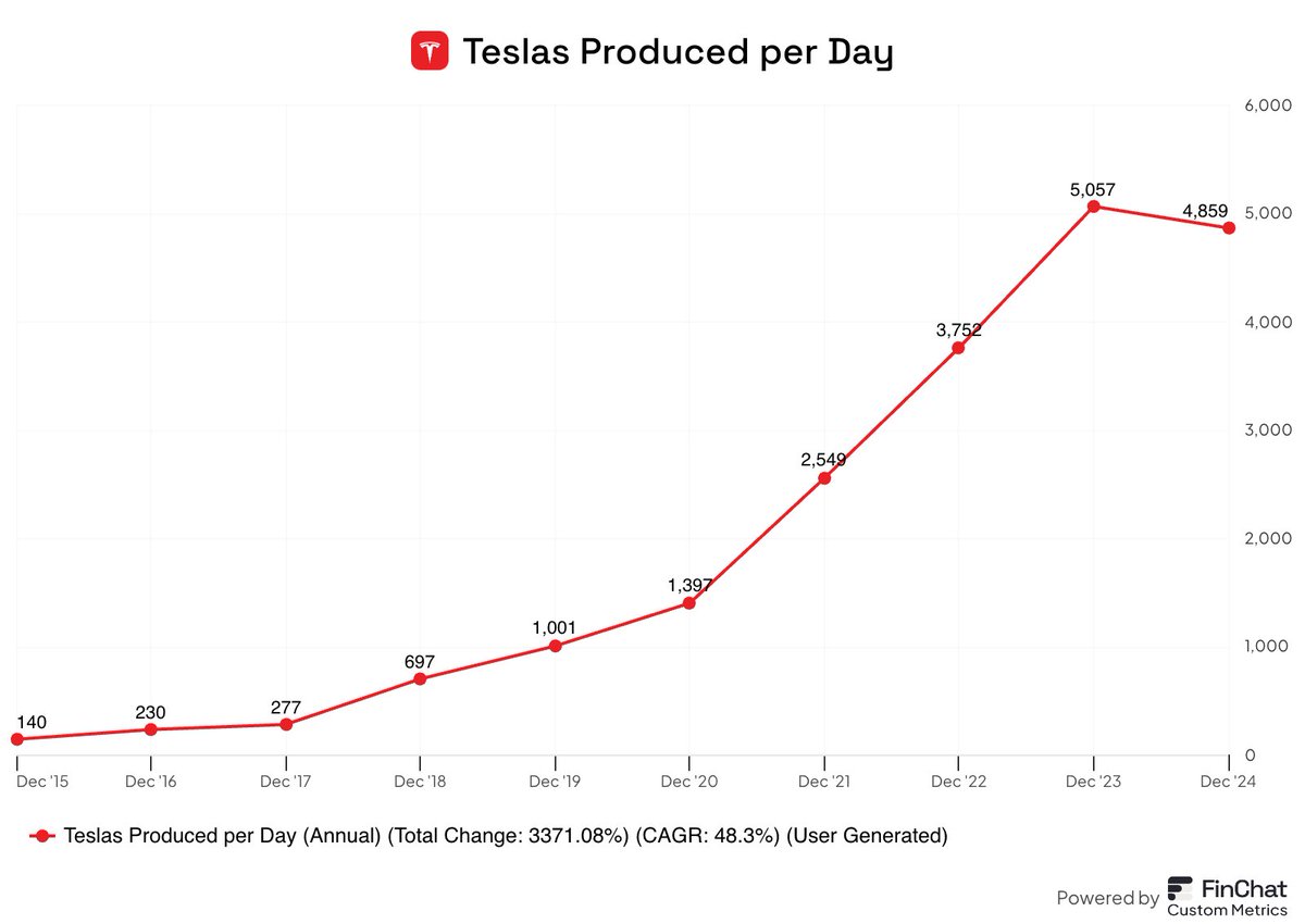 This year, Tesla produced an estimated 4,859 cars every single day. In 2015, they were producing just 140 cars per day.