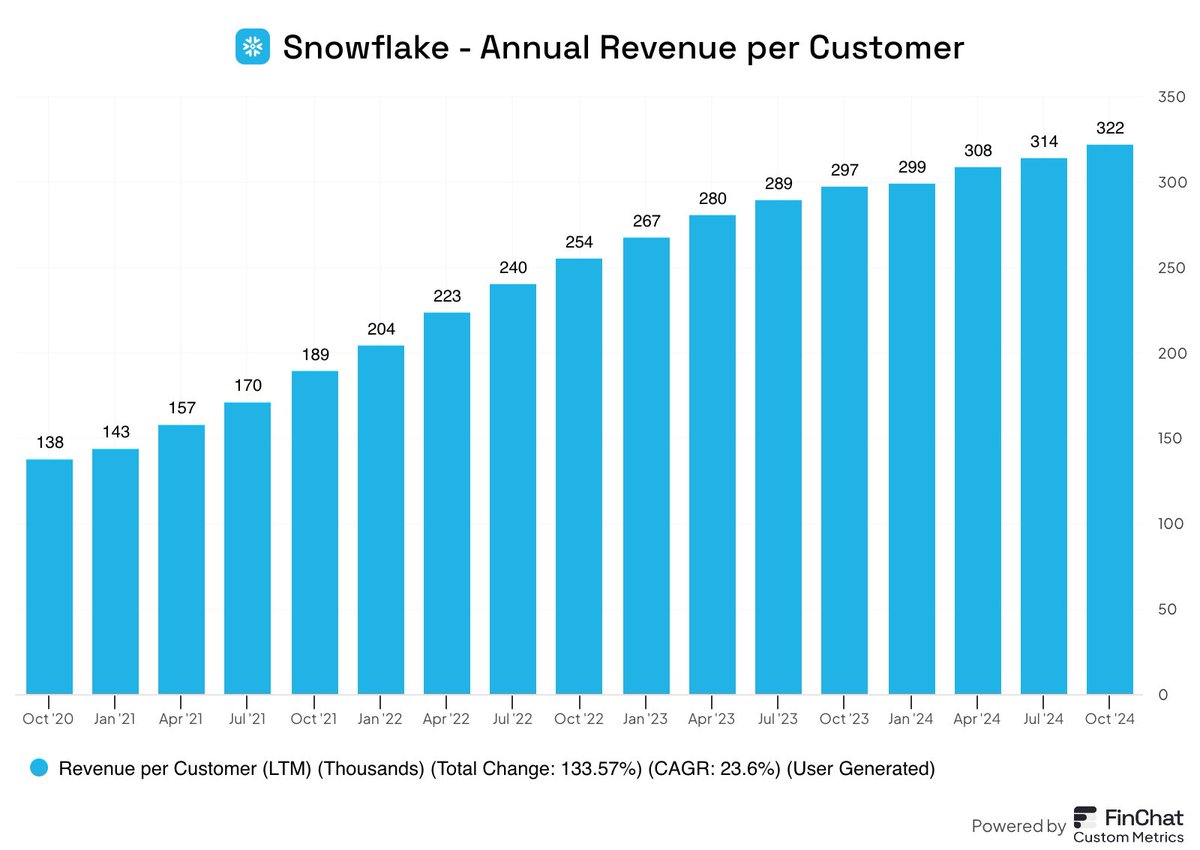 Not only is Snowflake growing its customer count, but the average revenue per customer has grown at 23.6% annually over the last 4 years.