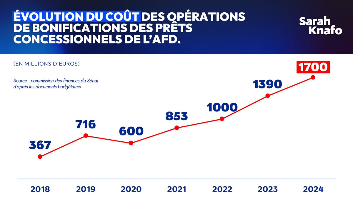 Seulement les prêts accordés par l’AFD sont généralement « concessionnels », c’est-à-dire qu’ils sont octroyés à des taux proches de 0%. Donc on s’endette à un certain taux, et on prête à un taux plus faible. L’Etat prend en charge le différentiel de taux d’intérêt. Ce poste a plus que quadruplé sous Macron pour atteindre 1,7 milliard d’euros en 2024. C’est 7 milliards payés avec #NotreArgent depuis 2017 pour ces prêts dont l’AFD ose affirmer qu’ils nous enrichissent. ⤵️