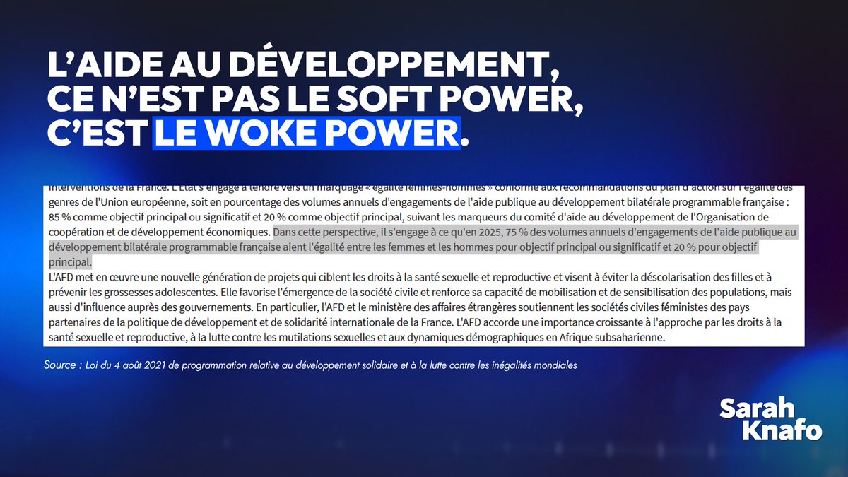 L’aide au développement, ce n’est pas le soft power, c’est le woke power. Et c’est assumé ! C’est écrit noir sur blanc : la loi de 2021 prévoit que 75 % des projets financés aient « comme objectif l'égalité femmes-hommes d'ici 2025 ».
