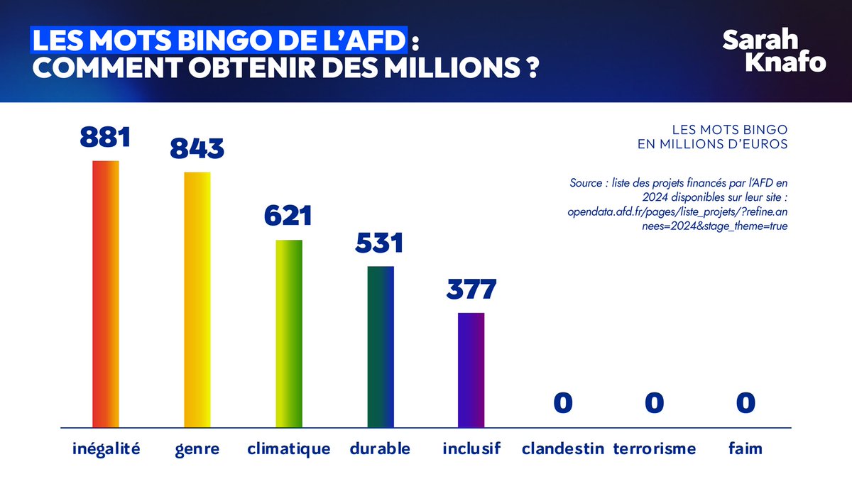 Les projets avec le mot « genre » obtiennent 843 millions d’euros en 2024. En revanche, on cherche toujours les financements pour ceux qui contiennent le mot « terrorisme » ou « faim ».