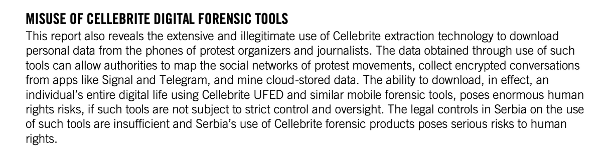 Earlier this week @Cellebrite announced that they were suspending Serbian customers following these repeated reports of misuse. This action is an important first-step to limit ongoing harm from their products
