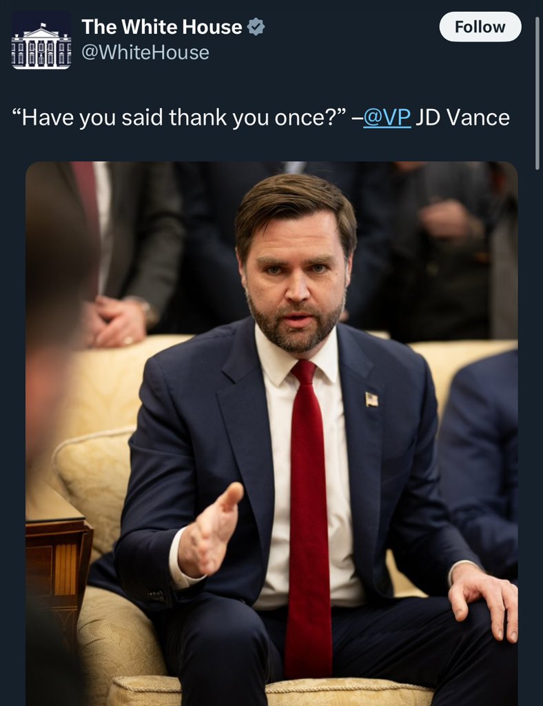 And yet, the Trump White House is now attempting a deliberate inversion of reality, manufacturing an image of Vance as the brave truth-teller while casting Zelensky as the ungrateful opportunist.