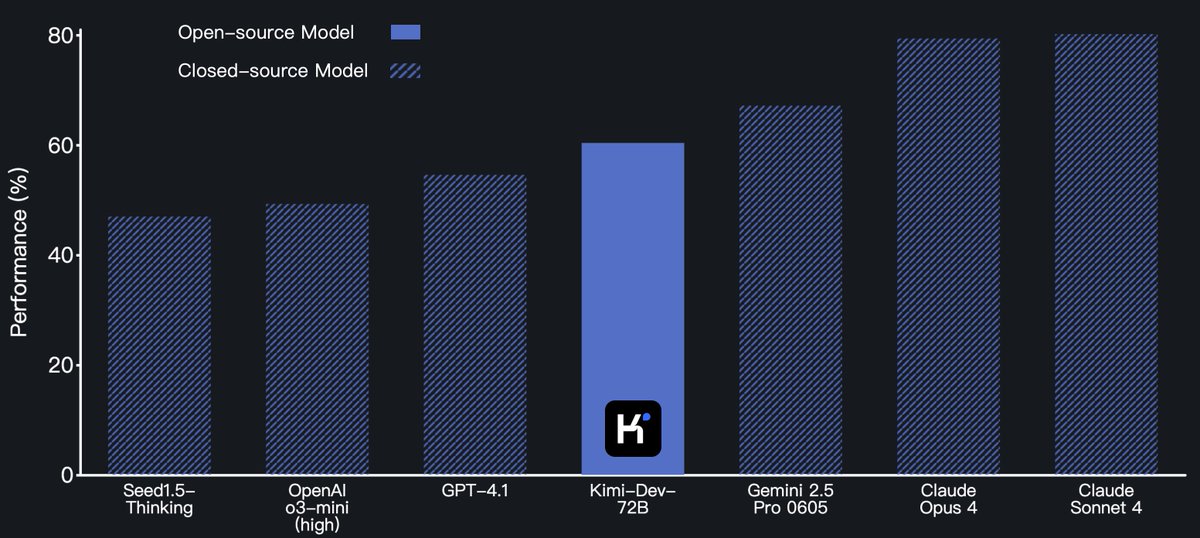 Moonshot AI just released Kimi Dev 72B that's officially the new SWE champion - outperforms all opensource models on SWE-bench Verified.