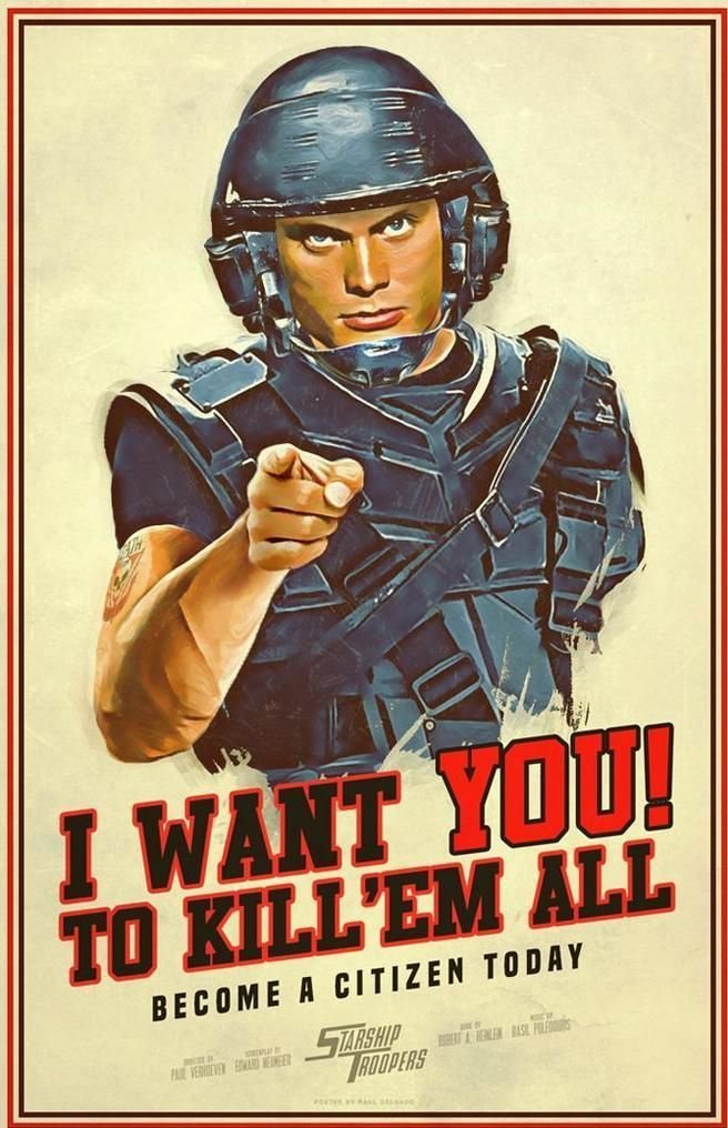 First, his film *forces* the audience to side with the Aryan-vibey, attractive youths against the mindless, hideous, alien bugs. The morally unambiguous, gore-filled spectacle is guilt-free and even Verhoeven's portrayal of military propaganda is more slapstick than surreal.
