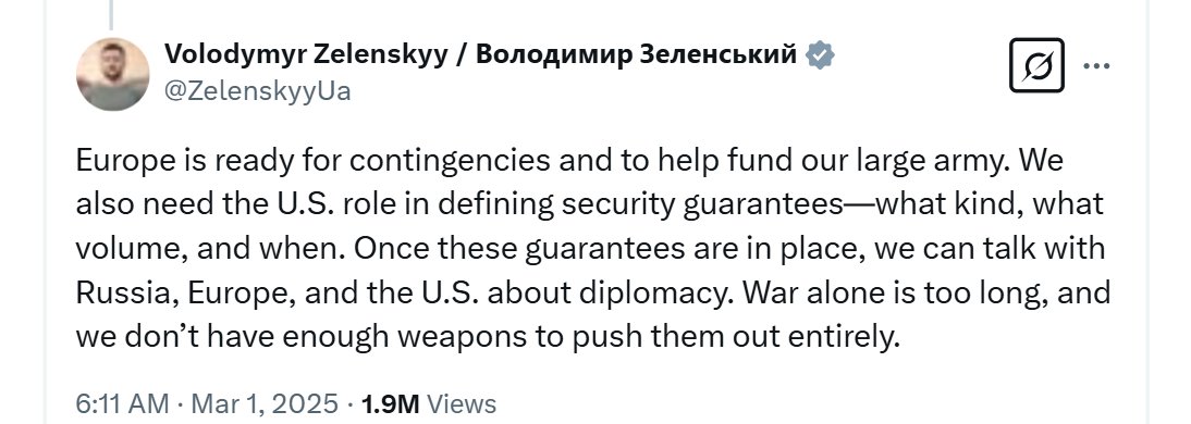4/ Zelenskyy final and clearly admits he wants much more first--things Trump already said no to. That's Zelenskyy's prerogative but America's prerogative is to say no we aren't giving any security guarantees up front b/c that risks expanding war.