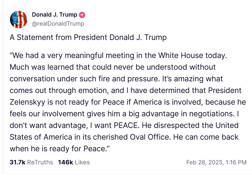 5/ Trump's Truth Social post right after meeting blew up had immediately put finger on pulse of problem that Americans are just now seeing. EU seems okay with Zelenskyy's demands so more power to them & God willing they can defeat Putin.