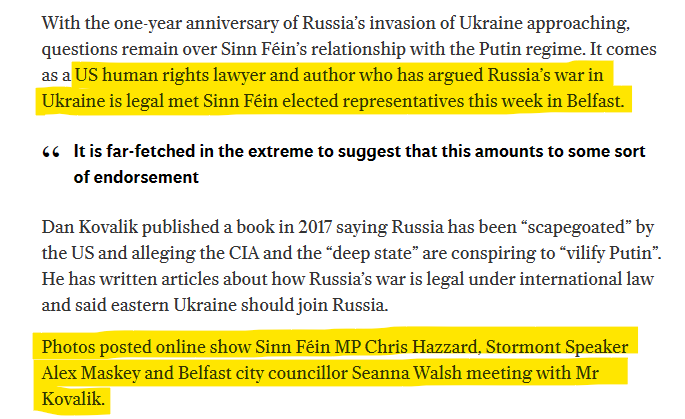 Through NAFO, I get to know all the characters around the world linked to Kremlin propaganda. It shocks me when they pop up in Ireland meeting Irish politicians. I was reading this article by Gabija Gataveckaite about Sinn Fein and what name popped up only "Dan Kovalik"
