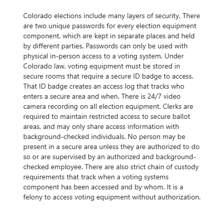 @cologop @JenaGriswold SOS Griswold's office says there is no "immediate security threat" because no one could have used the leaked passwords to compromise voting systems unless they obtained physical access to the equipment through ID-badged secure rooms that are video-monitored.