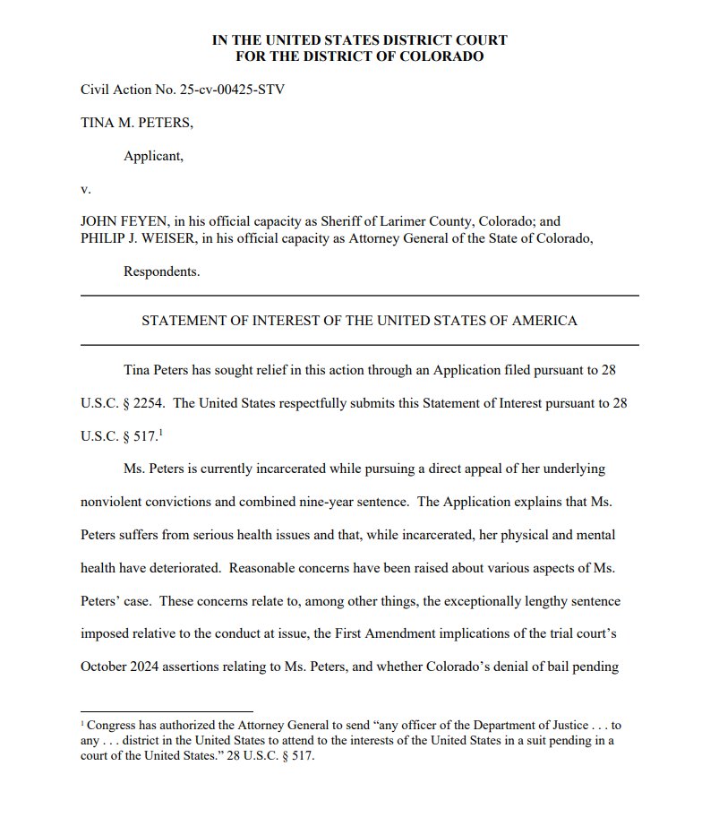 The Justice Department's 'Statement of Interest' in Tina Peters' case, filed today, says her prosecution will be reviewed in a search for "abuses of the criminal justice process." (2/3)