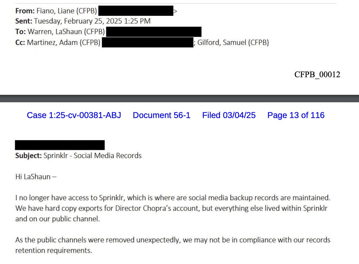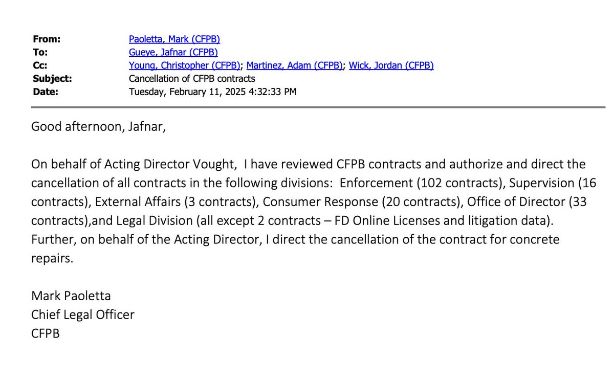 JUST IN: A trove of emails posted tonight in court reveal the utter chaos unleashed at the CFPB after Acting Director Russ Vought ordered a total work stoppage on Feb. 10. Mass cancelation of contracts soon followed. documentcloud.org/documents/2555…