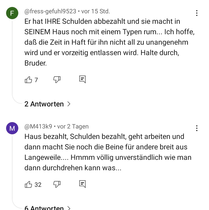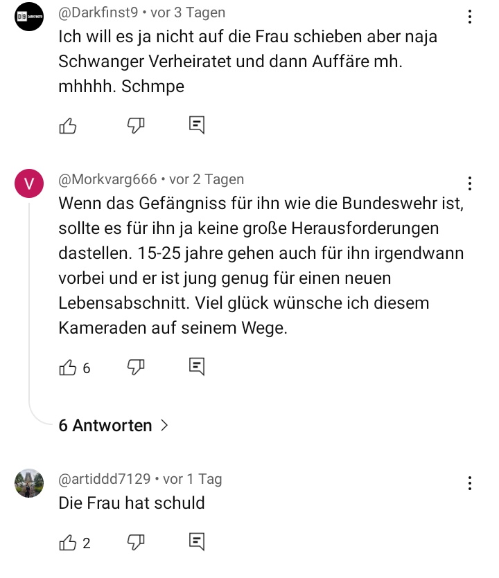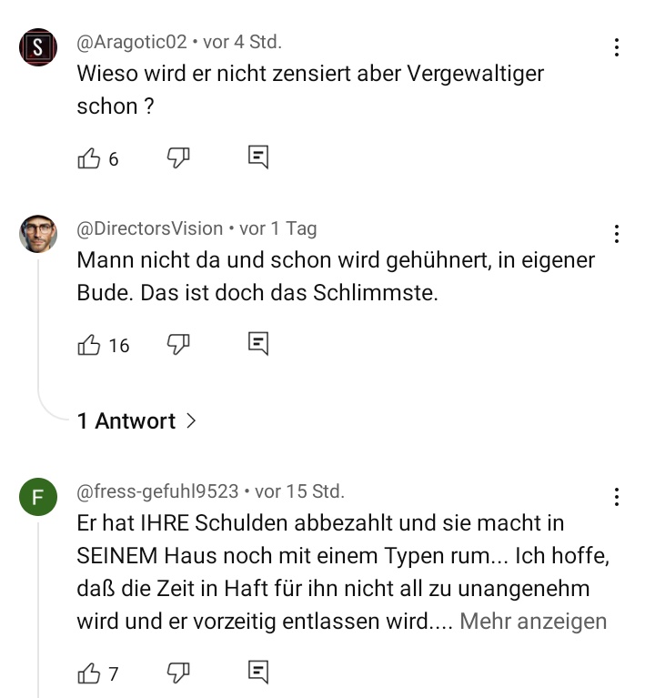Und es geht weiter und weiter und weiter, @SpiegelTV sieht sich nicht in der Verantwortung zu moderieren, einzuschränken oder zu blockieren. Hier ermutigen sich Männer gegenseitig zu femiziden und anderen Gewalttaten, fordern ein Besitzrecht auf Partnerinnen und alle schauen zu!