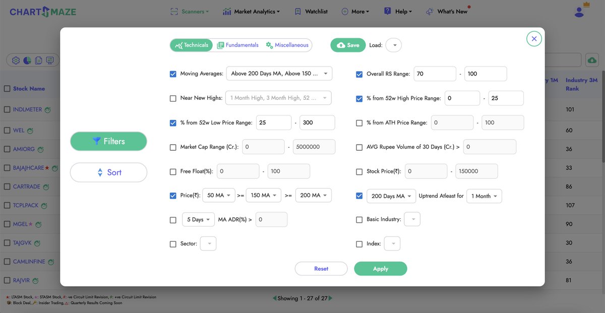 Click Apply to obtain the list of stocks satisfying the criteria and study the charts in detail🔍