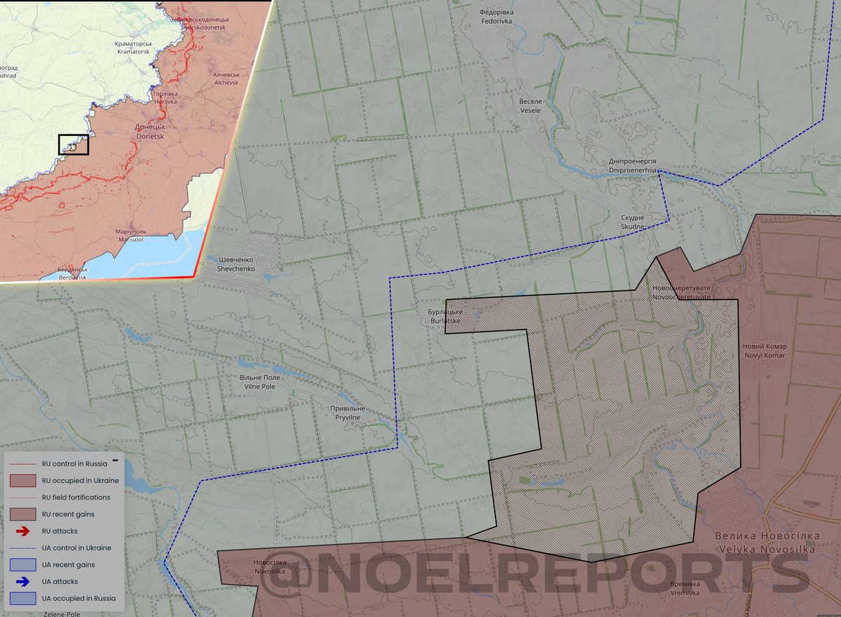 A review of the situation. New footage shows that Russian troops have advanced northwest of Velyka Novosilka to Burlat'ske, and entered the latter. This may have happened less recently, as little movement has been reported here in recent days.