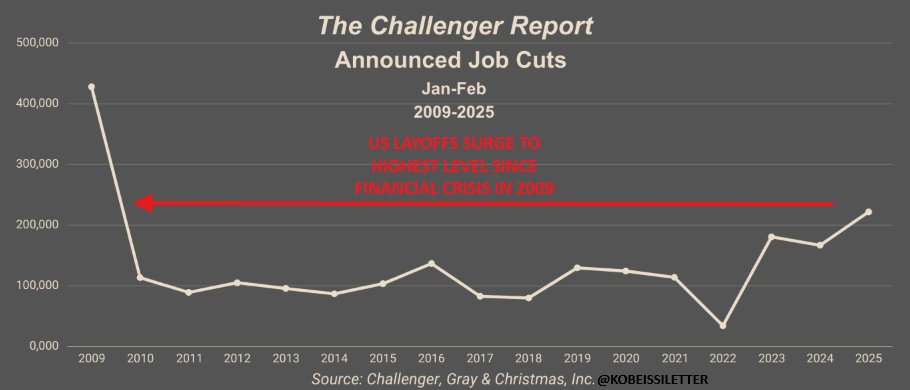 The US saw 172,000 job cuts in February, with YTD government layoffs SURGING +41,300% due to @DOGE.