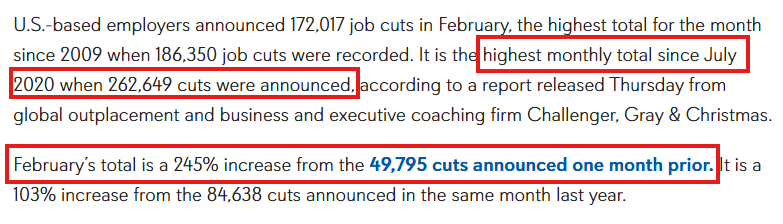 In February, there were a total of 172,017 job cuts in the US which marks a +103% year-over-year jump.