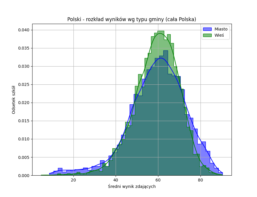 Okazuje się, że wyniki z egzaminu ośmioklasisty z polskiego nie są bardzo zróżnicowane między szkołami pomiędzy miastem a wsią - w mieście jest więcej ekstremów (top szkoły i szkoły specjalne) ale nie ma ich bardzo dużo w porównaniu ze wsią.