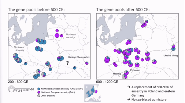 Na jednym obrazku wygląda to tak. Genotypy mieszkańców Europy Środkowej w późnej epoce żelaza (przed 600 rokiem naszej ery) są podobne do genotypów dzisiejszych Skandynawów, a po roku 600 do genotypów dzisiejszych Polaków przy czym stopień wymiany populacyjnej to 80%-90%. Pozostałe 10%-20% to geny wcześniejszych, germańskich mieszkańców. Populacją z epoki żelaza najbardziej genetycznie podobną do przybyszów byli mieszkańcy terenów obecnej Litwy (niestety nie ma danych genetycznych odnoszących się do epoki żelaza z terenów obecnej Białorusi).