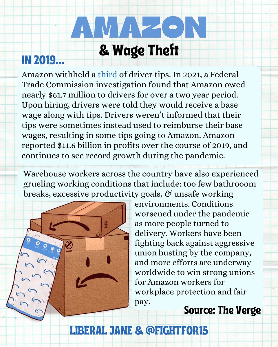 📦 In 2019, Amazon withheld a third of its driver’s tips before being ordered to pay the $61.4 million back in a federal lawsuit. Warehouse workers across the country have experienced grueling working conditions that include: too few bathroom breaks, & unsafe working conditions.