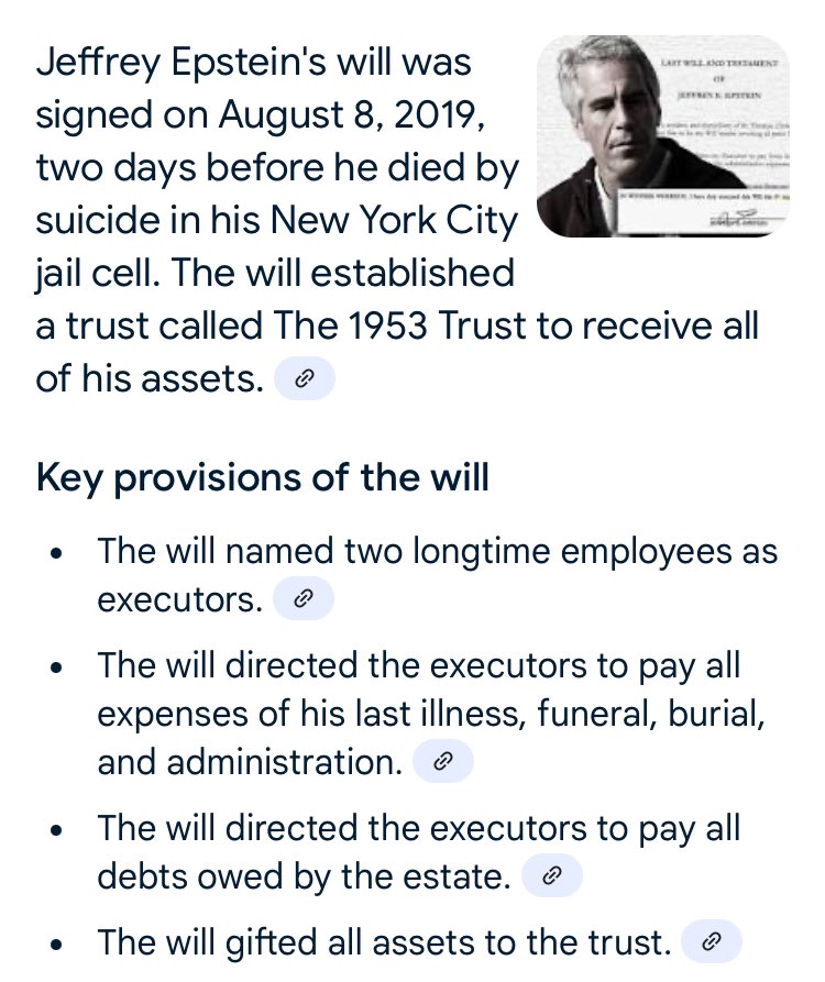 But the story gets better. Just 2 days before Epstein died, he signed his Will and listed his 500 million dollar estate to fall to his brother upon his death via a trust.