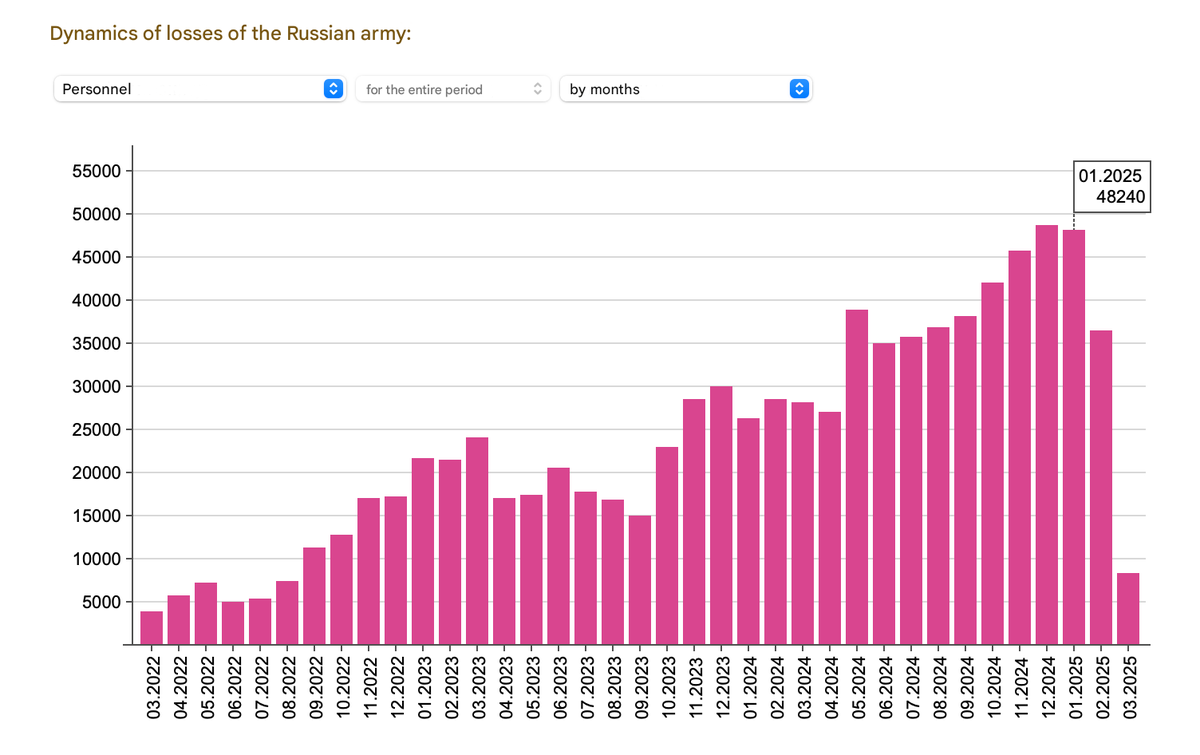 The Ukrainian losses are high, but not as high as Russian. 65,000 Ukrainian soldiers have died, with estimates reaching 120,000 including the missing, UAlosses.