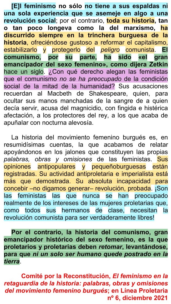 y que “no tiene a sus espaldas ni una sola experiencia que se asemeje en algo a una revolución social”, como queda fundamentado en el profundo y amplio trabajo elaborado por el Comité por la Reconstitución (‘El feminismo en la retaguardia de la historia…’, LP nº 6, 2021).