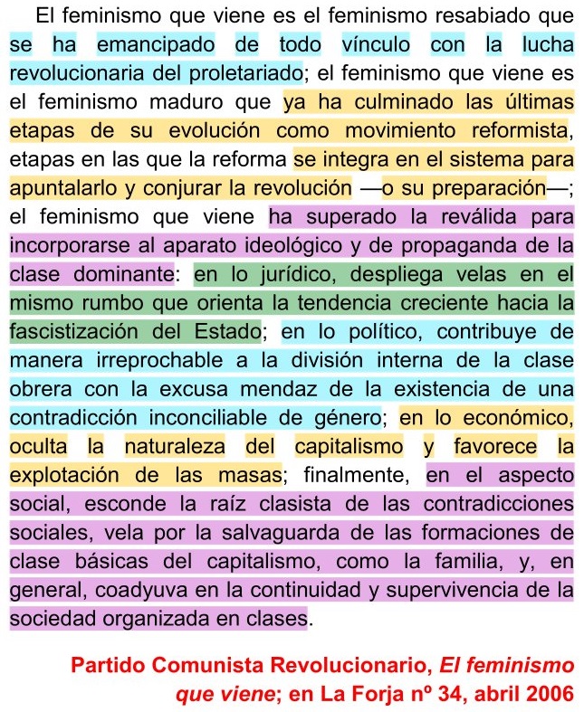 Mientras el comunismo revisionista abanderaba el feminismo de clase y le compraba sus “aportes” y sus prejuicios, la Línea de Reconstitución sí vio venir, hace 20 años, esta tendencia de clase y su carácter reaccionario en los planos jurídico, político, económico y social: