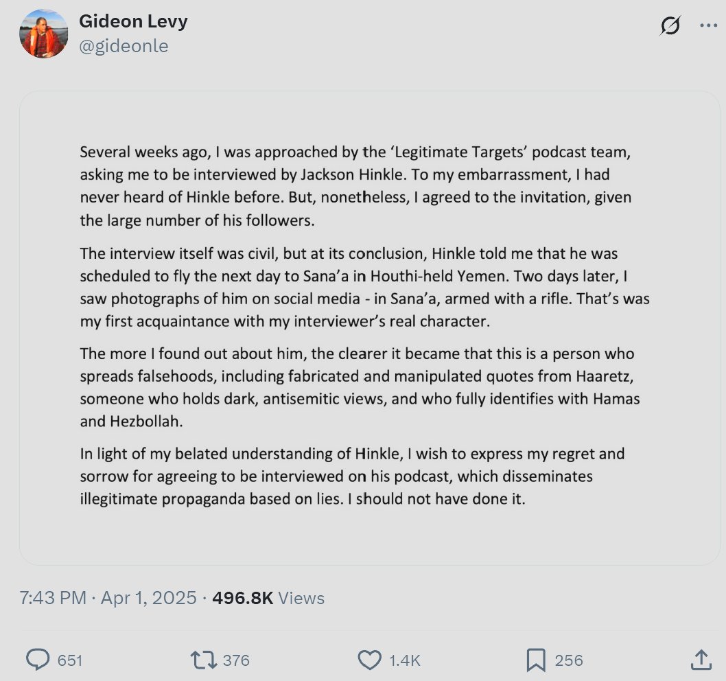 About @haaretz “journalist” @gideonle's "apology" for appearing on the podcast of one of the worst terror-supporting Jew-haters out there: @jacksonhinklle 🧵 /1.