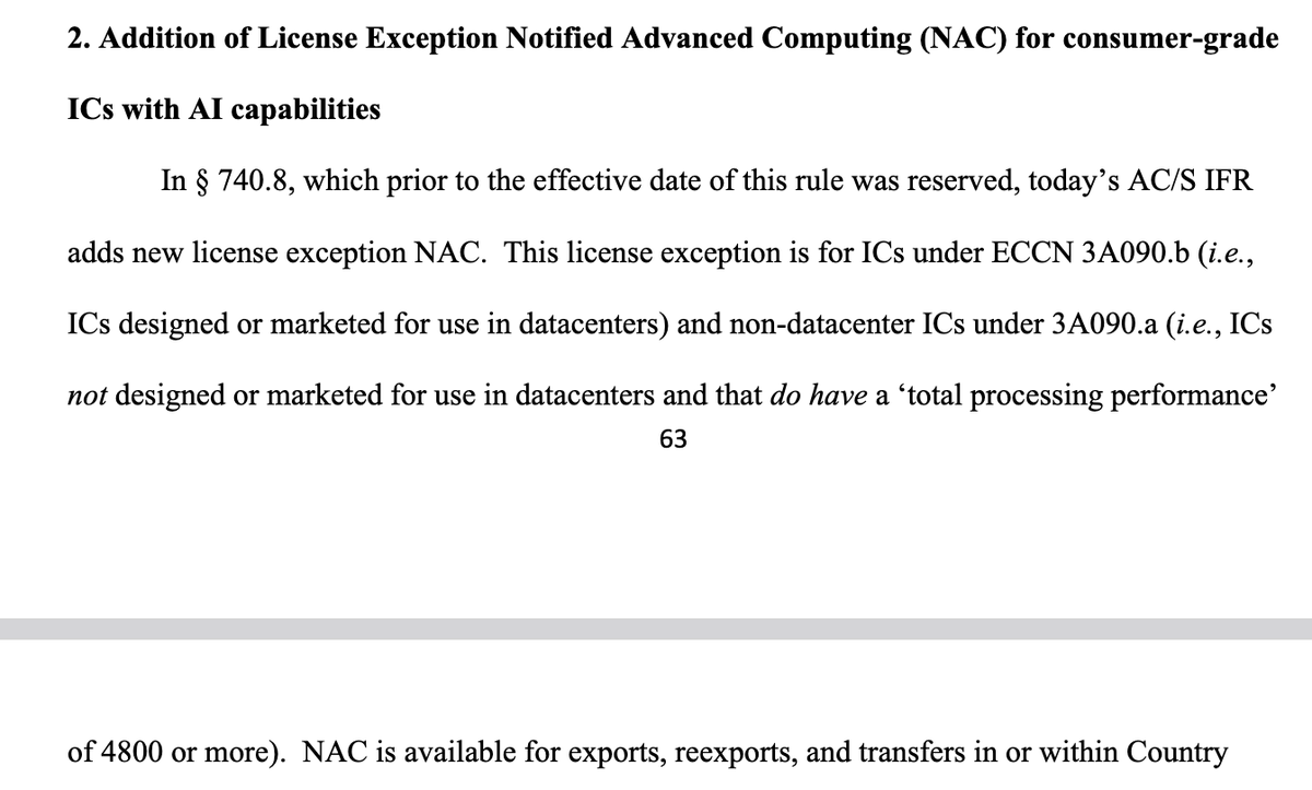 A threshold on computational performance alone would eventually hit consumer chips, for example, future gaming GPUs. To mitigate this, they added a license exemption for "consumer-grade ICs". These are ICs "not designed or marketed for use in datacenters". 3/