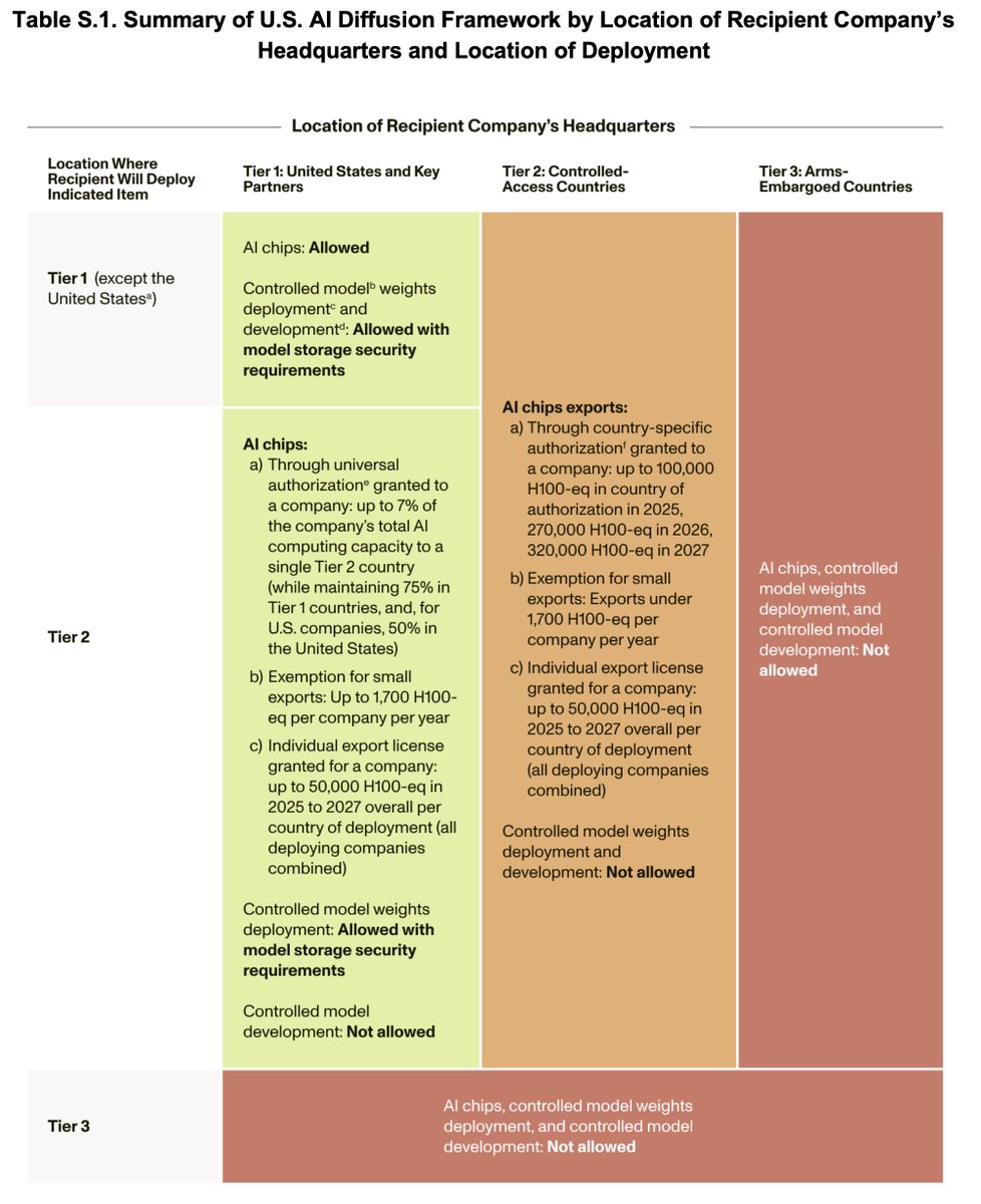 This table gives the best overview: The framework applies rules based on company HQ location and export destination—covering both advanced AI chips and certain model weights. 2/ rand.org/content/dam/ra…