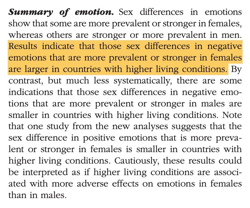 “Results indicate that those sex differences in negative emotions that are more prevalent or stronger in females [such as guilt and shame] are larger in countries with higher living conditions (p.20)."